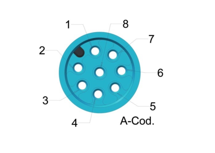 Angle receptacle 8pole A-Code, incl. pin contacts 0,24-0,50mm² (AWG24-20) rotatable 0°-330° (HS-Code: 85389099 / COO: DE)